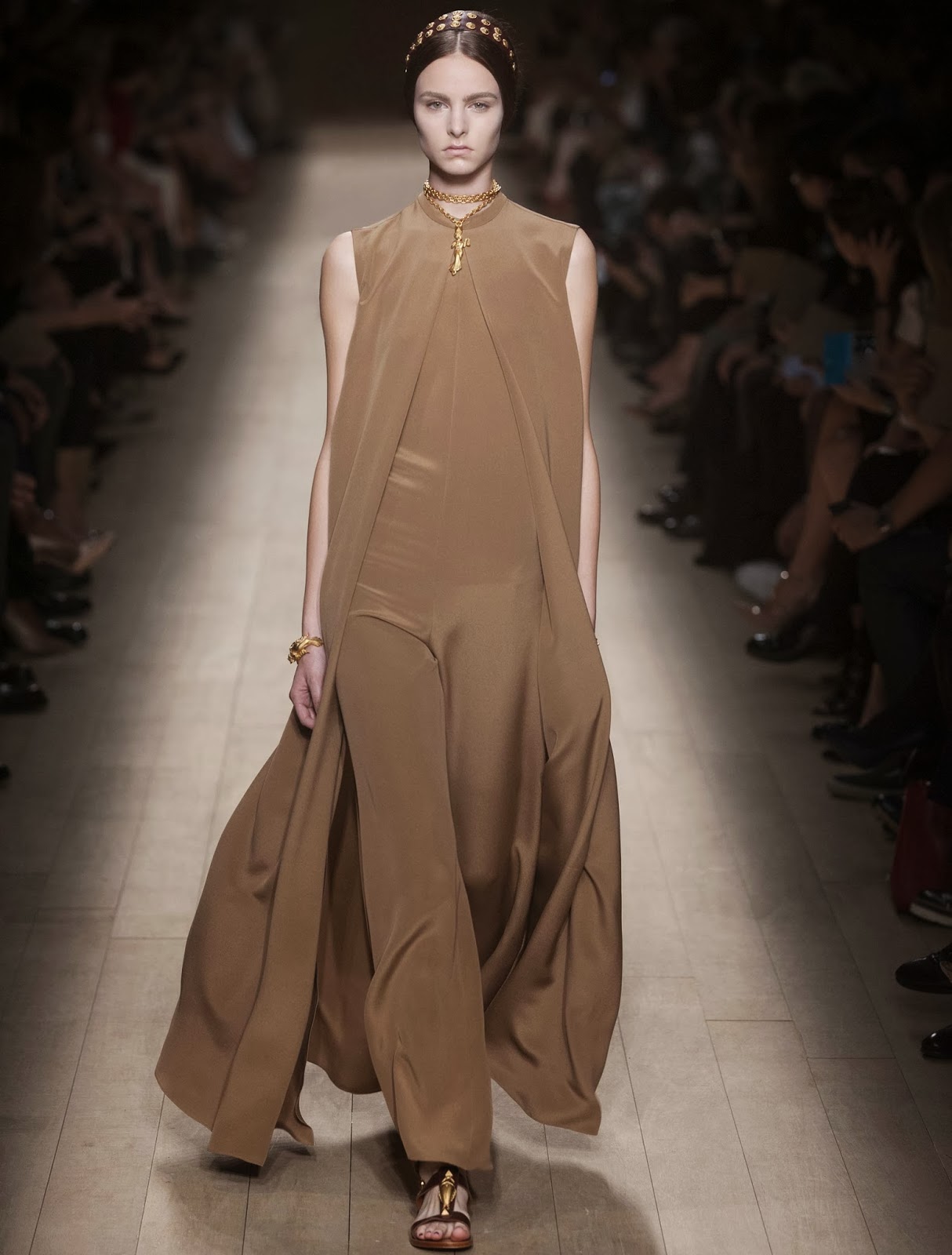 Valentino conquista con suggestioni che arrivano dal mondo della lirica. Stili che vanno dal bhoemien all'aristocratico alle allusioni etniche. Abiti lunghi minuziosamente ricamati, pizzi e voile, giochi di trasparenze, stampe e lavorazioni geometriche e un tocco di animalier.